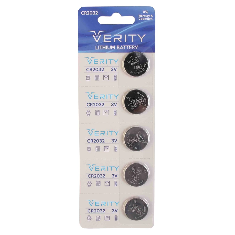 باتری لیتیومی CR2032 وریتی دارای بسته بندی اقتصادی و 5 عددی بوده و این باتری ها دارای ضخامت 2.6 میلی متر و قطر 20 میلی متر میباشند.این باتری ها در ریموت ماشین ها دستگاه های دوربین و ریموت های درب برقی بیشتر کابرد دارند